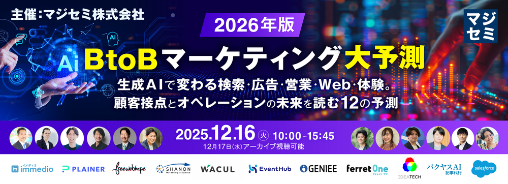 生成AIの普及により、BtoBの情報収集・比較・意思決定プロセスは大きな転換点を迎えています。ユーザーがAIアシスタントを活用する機会が増えることで、検索・広告・Webサイトを取り巻く環境にも新たな最適化の視点が必要になりつつあります。また、営業プロセスの高度化やWeb運用の仕組み化、体験型コンテンツの重要性など、マーケティングと営業の多くの領域で変化が進んでいます。